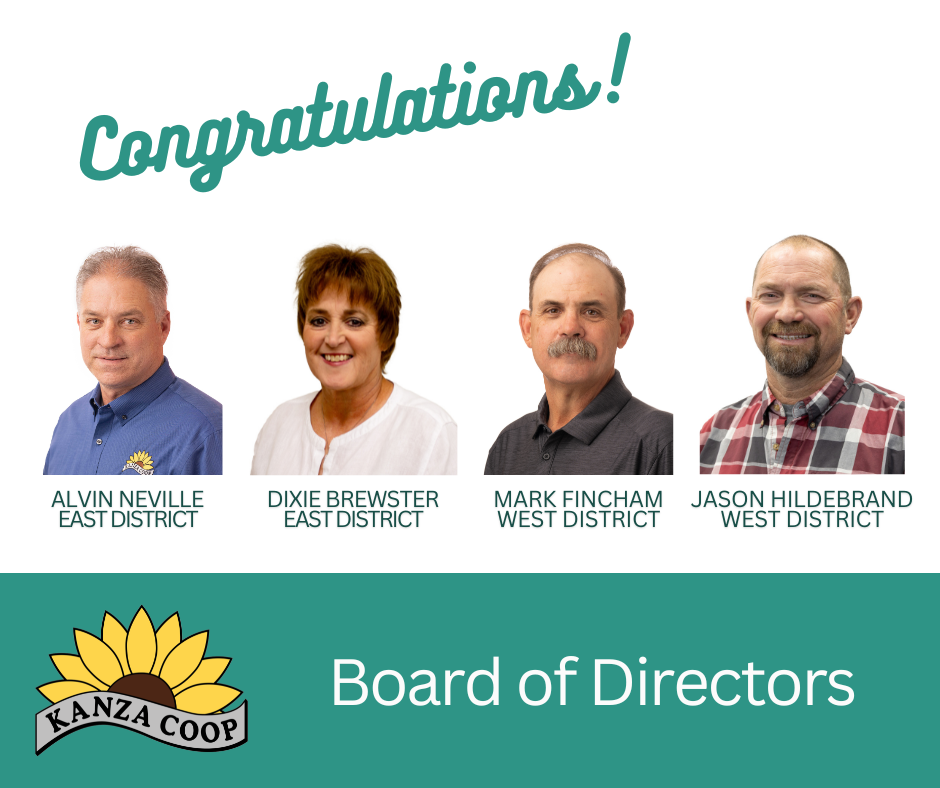 Kanza Cooperative Association held the annual election to fill expiring terms of board members. Alvin Neville and Dixie Brewster were re-elected in the Eastern District and March Fincham was re-elected in the Western District. Jason Hildebrand was elected to fill the other Western District seat available.